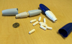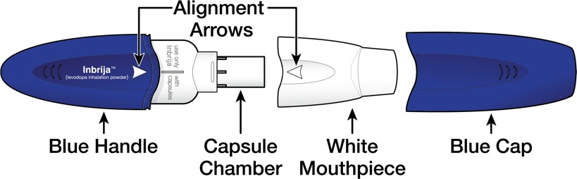 The Acorda dry powder inhaler platform delivers medication directly to the respiratory system. Commonly seen under the INBRIJA brand name, to deliver prescription Parkinson’s medication. The inhaler employs a dry powder capsule technology that releases a measured dose of medication when activated and inhaled by the user.